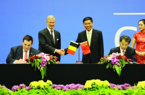 10月24日,比利时王储菲利普(左二)与工商银行董事长姜建清(左三)共同见证签字仪式。 新华社 图