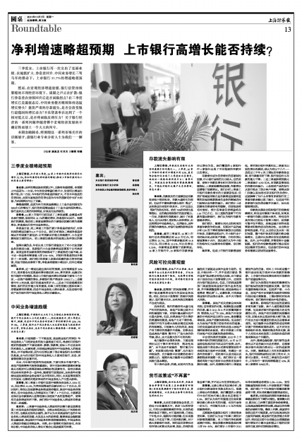 赵庆明:这一增速远超出我年初的预测,当时预测值在20%左右,现在看全年实现盈利增长能达到30%,甚至更多,远超过年初市场的平均预期。推动上市银行盈利增长的因素主要有几个方面,一是资产规模的增长,多数银行资产增速在10%以上;二是随着今年3次加息,银行的息差有所扩大;三是由于信贷规模受到管制,银行的定价能力有所提高,利率上浮的贷款比重和利率上浮幅度都有所提高;四是中间业务收入增长较多,尤其是银行理财产品为银行的中间业务收入增长贡献较大。