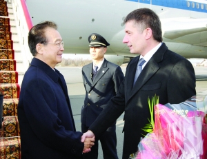 11月6日,国务院总理温家宝抵达圣彼得堡普尔科沃机场,出席将在这里举行的上海合作组织成员国总理第十次会议。图为俄罗斯政府高级官员到机场迎接温家宝。