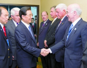 前来出席亚太经合组织第十九次领导人非正式会议的国家主席胡锦涛当地时间10日下午在夏威夷州首府檀香山会见了美国工商界代表。胡锦涛积极评价美国工商界为促进中美交流、加强亚太经济合作发挥的积极作用,强调中美经贸合作的本质是互利双赢,中美深化和拓展经贸合作,关乎两国人民福祉,也关乎世界经济复苏和发展前景,希望美国工商界为促进中美经贸合作和两国关系发展作出更大贡献。胡锦涛指出,按目前的水平和增长速度,中美贸易额完全可能在今后三四年突破5000亿美元。新华社图