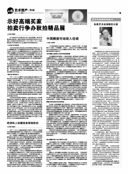 谭勋认为,国内雕塑市场局部和个体行情早已开始。“中国传统的审美模式是以文人画为主流,这是我们骨子里的审美倾向。而改革开放以后,人们最先接触的是油画,最早的当代艺术也是从油画开始的,所以油画最先介入了收藏家的视野,并形成了收藏基础。雕塑比油画晚几年进入市场,并形成了以隋建国、向京、展望等艺术家个体拍卖繁荣的局部行情。”