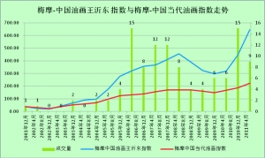 我们通过梅摩-中国油画王沂东指数与梅摩-中国当代油画指数走势比较图来分析王沂东油画作品市场历年来的表现,其中成交量是王沂东油画作品每半年的成交件数。