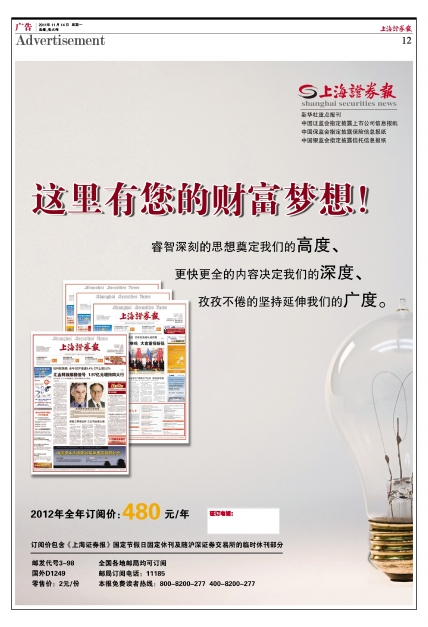 经上海证券报社授权,中国证券网独家全权代理《上海证券报》信息登载业务。本页内容未经书面授权许可,不得转载、复制或在非中国证券网所属服务器建立镜像。欲咨询授权事宜请与中国证券网联系 (400-820-0277) 。