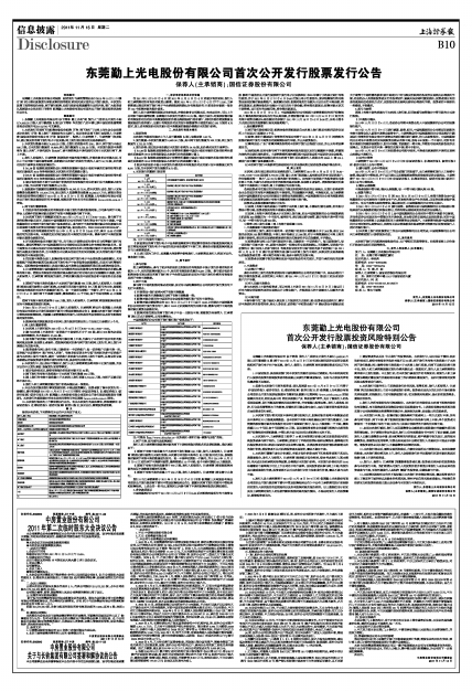 东莞勤上光电股份有限公司首次公开发行股票发行公告