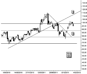 对于2012年,多头希望看到运行至上升趋势线A以上的行为,目标在130美元以上。谨慎的多头希望价格上涨至趋势线A,然后从趋势线A回撤。这给出目标价在115美元至125美元之间。对于这些多头来说,下方目标在98美元附近的支撑上。空头则密切关注油价是否会下跌至88美元的支撑以下,若下跌至78美元以下,下方目标在68美元。