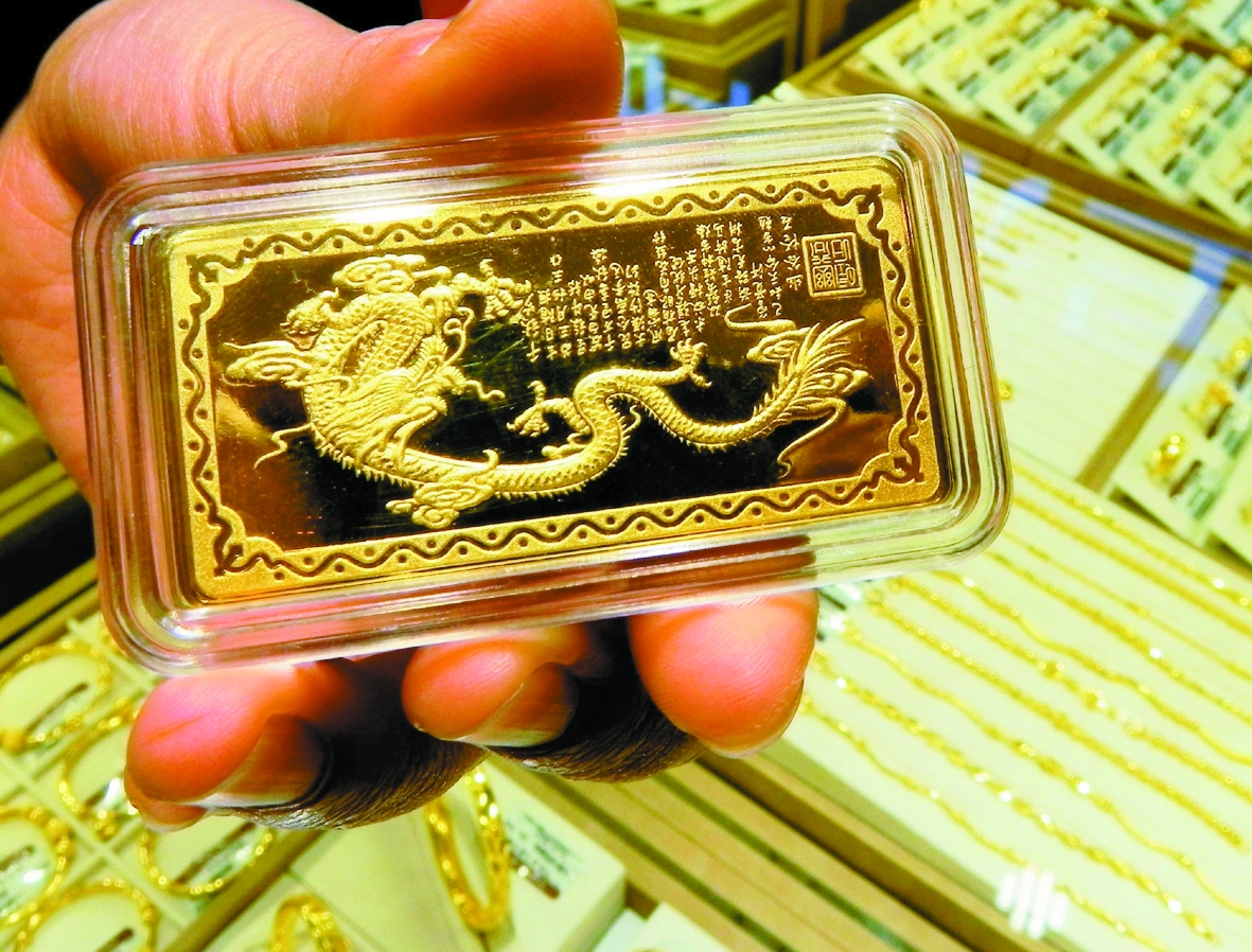 受到美联储再宽松预期提振,纽约商品交易所黄金期货价格1月27日连续第三个交易日上扬,上周累计涨幅超过4%。图为1月28日,顾客在杭州一金店选购雕龙金条。 本报传真图