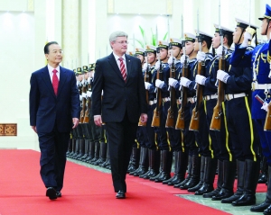 国务院总理温家宝8日在人民大会堂与加拿大总理哈珀举行会谈。温家宝表示,中加经济互补性强,双方要充分利用这一优势,应对日趋激烈的国际竞争。《中加投资保护协定》谈判已经完成,希望早日签署这一重要文件,促进相互投资;加紧做好“中加经济互补性联合研究”工作,在此基础上制定全面加强经济合作规划,探讨商签中加自由贸易协定的可行性;在能源资源领域建立长期、稳定、多元的合作伙伴关系。新华社 图