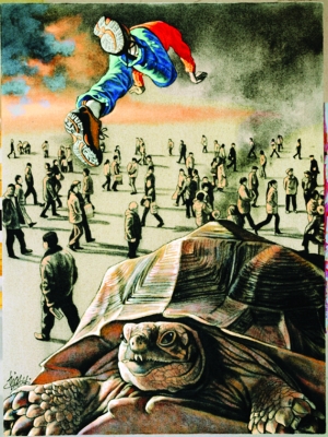 “可这当初的异样,到如今已经成为我们现实中的常态了。”钟飙说,当他的艺术达到了某种成熟阶段的时候,便开始进一步追问这异样图像背后所隐藏的规律和真相。“社会、人类世界从哪里来、到哪里去”成为他心头的疑问。