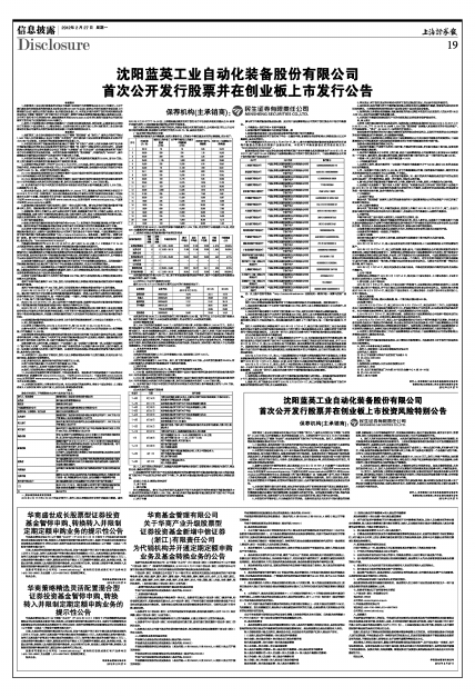 2、发行人与保荐机构(主承销商)郑重提示广大投资者注意投资风险,理性投资,认真阅读本公告和同日刊登在《中国证券报》、《上海证券报》、《证券时报》和《证券日报》上的《沈阳蓝英工业自动化装备股份有限公司首次公开发行股票并在创业板上市投资风险特别公告》。
