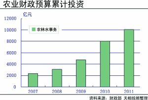 正是如此,为国家加大“三农”投入形成了一个稳定增长的机制。统计数据显示,2004年至2010年,中央财政支持“三农”投入从2626.2亿元增加到8579.7亿元,年均增长21.8%,其中与粮食生产相关的投入从1029亿元增加到4575亿元。财政部预计,2011年中央财政“三农”支出有望达到10408.6亿元,增长21.3%。
