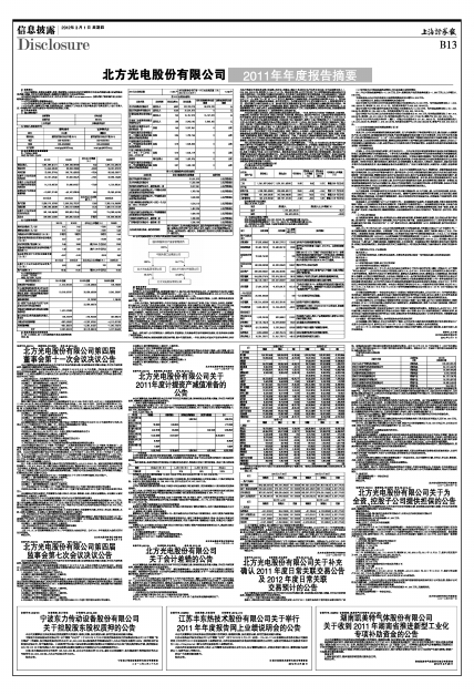 北方光电股份有限公司第四届董事会第十一次会议于2012年2月16日以传真、电话及专人送达书面通知的方式告知各位董事。会议于2012年2月29日上午9:00在公司商务中心会议室召开,会议应到11董事人,实到董事11人,会议由董事长王小鹏先生主持,会议符合《公司法》和公司《章程》的有关规定,所作决议合法有效。会议作出如下决议: