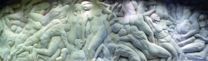 《生命之墙》是曹瑞强从事雕塑创作以来最大的一件作品,2009年年底开始筹备。2010年1月,在上海青浦一座大仓库里,曹瑞强带领着他的团队开始了实体创作。50多吨紫砂从宜兴运到上海,曹瑞强他们用双手一把一把地把泥堆到墙上,再精雕细琢出来。大仓库没有空调,大家的双手都冻到没有了知觉。2010年3月,作品完成了泥塑,经过两轮倒模,最后被分成16块运到了世博园,接着又是安装、修补……曹瑞强告诉记者,“《生命之墙》取材于挪威首都奥斯陆维格兰雕塑公园的著名的《生命之柱》雕塑,在原型作品柱上密密麻麻交叠着雕有121个情态不同、奋力抗争的裸体浮雕造像。从婴儿出生开始,到孩子们捉迷藏,少年们扭打玩耍,再到情人窃窃私语,老人们熬度暮年,人生各个时期的人物形象都栩栩如生。”据说根据作者古斯塔夫·维格兰塑造的模型,3名石匠整整用了14年时间才雕刻完成,而曹瑞强只用了两个多月的时间。