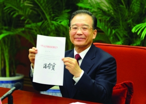 3月28日,国务院总理温家宝主持召开国务院第七次全体会议,决定任命梁振英为香港特别行政区第四任行政长官,于2012年7月1日就职。温家宝总理签署了任命梁振英为中华人民共和国香港特别行政区第四任行政长官的国务院第616号令。 新华社 图