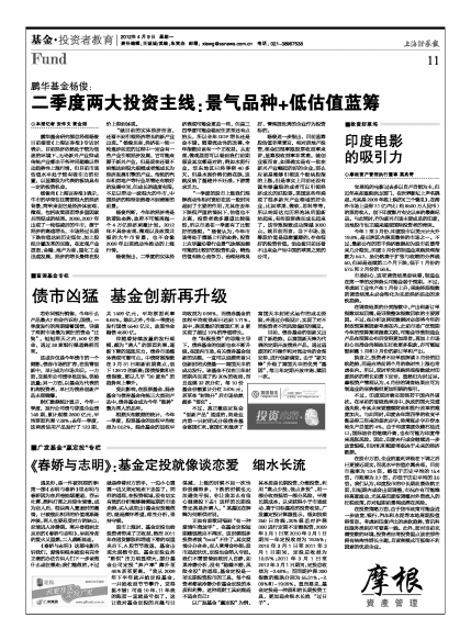 “一季度的股市上涨我们理解流动性相对宽松在这一段时间起到了主要的作用,尤其在去年下跌很严重的情况下,估值也不太高,投资者做多愿望比较强烈,所以市场在一季度有了比较好的涨幅。”杨俊认为,今年市场将处于震荡上行的态势。投资上应尽量沿着行业景气脉络发掘可能的比较好的投资机会,精选估值有核心竞争力、治理结构良好、管理层优秀的企业作为投资标的。