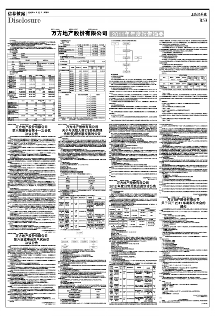 万方地产股份有限公司定于2012年5月10日(星期四)召开2011年度股东大会。会议主要事项如下: