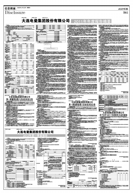 大连电瓷集团股份有限公司(以下称“公司”)第一届董事会第八次会议于2012年4月19日,在辽宁省大连市沙河口区中山路478号华邦上都大厦A座12楼公司会议室以现场方式召开。会议通知于2012年4月9日以书面送达、电子邮件及电话方式向全体董事发出,本次会议应参会董事12名,实际参会董事12 名,公司监事、高级管理人员列席了会议。