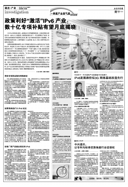 按照国务院整体部署,2012年将成为我国IPv6商用试点及产业化的元年。相应的,从2011年底至今,相关政策利好不断。今年2月,发改委发布针对下一代互联网发展的两个“专项”通知;3月底,发改委再度联合工信部等部委共同发布了《下一代互联网“十二五”发展建设的意见》的通知。用业内人士的话说,“在IPv6产业已经达到99度的关键时候,国家添了一把火,把水烧开了”。