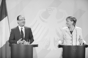 周二晚间,默克尔与法国新任总统奥朗德举行联合记者会。默克尔表示,出台刺激经济增长措施的要求会被“考虑”,且欧盟也会主动向希腊提出方案。“希腊会留在欧元区,希腊国民也会以这样的意愿投票。”默克尔表示。奥朗德此前击败萨科齐,成为1981年来首位当选法国总统的社会党人,他反对默克尔倡导的通过紧缩政策解决债务危机。