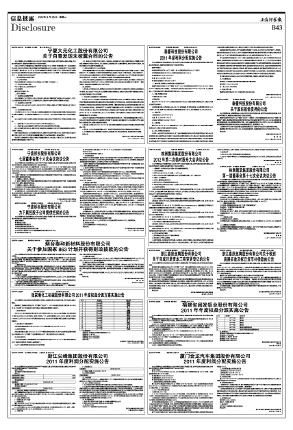 浙江尖峰集团股份有限公司2011年度利润分配方案经2012年5月8日召开的公司2011年度股东大会审议通过。股东大会决议公告刊登于2012年5月9日的《中国证券报》、《上海证券报》以及上海证券交易所网站。
