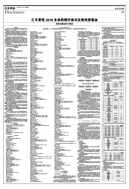 汇丰晋信2016生命周期开放式证券投资基金更新招募说明书摘要