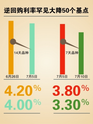 回顾自6月底来央行连施逆回购的操作思路,中标利率节节走低成最大特点。14天逆回购中标利率从6月底的4.20%降至上周的4.00%,走低20个基点;7天逆回购利率降幅更大,从3.95%降至3.30%,走低65个基点。