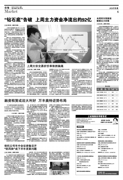 上周两市有30多家板块资金净流出,资金净流出排行中,有超过25家板块净流出金额在1亿元以上。有色金属、房地产、银行、酿酒食品、机械等5家板块上周资金净流出居前,分别净流出资金8.93亿元、8.77亿元、8.6亿元、6.71亿元、6.55亿元。其中有色金属板块中个股包钢稀土、厦门钨业净流出居前,分别净流出1.57亿元、1.11亿元,房地产板块中个股中体产业、苏州高新净流出居前,分别净流出0.61亿元、0.45亿元。