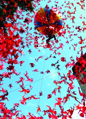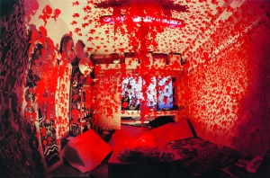 选择剪纸,对于一个从山东农村走出的艺术家来说,或许不足为奇。创作于1990年的《招魂堂》,复制了中央美术学院的一间旧工作室,他用红色的人形剪纸,布满了窄小的房间,让人感到神秘窒息。这件极具视觉冲击力的作品,使“人形剪纸”成为他作品的标志性符号。