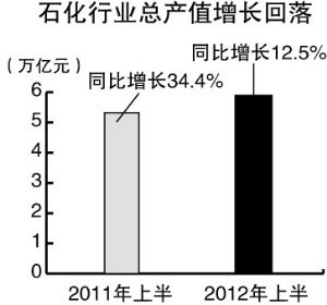 据中国石油和化学工业联合会发布的上半年石化行业经济运行报告(下称“报告”)显示,石油和化工行业规模以上企业26696家,1~6月实现总产值5.89万亿元,同比增长12.5%,但增幅较去年同期回落21.9个百分点;进出口总额为3320.69亿美元,增长10.4%,增幅比去年同期回落22.3个百分点;1~5月,全行业实现利润总额3031.44亿元,同比下降14.4%。