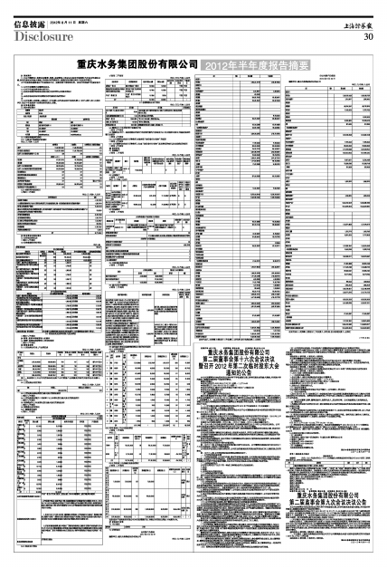 重庆水务集团股份有限公司2012年半年度报告摘要