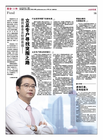 另外,背靠江浙也是德邦基金的一大优势。在易强看来,江浙是民营企业最有活力的地方,民企对资金有着饥渴的需求,不怕找不到好项目。而对于客户来说,能够帮助他们投入到以前不能投资的实业领域中去,从这个角度来看,未来基金专户新业务将起到直接投融资平台的作用。