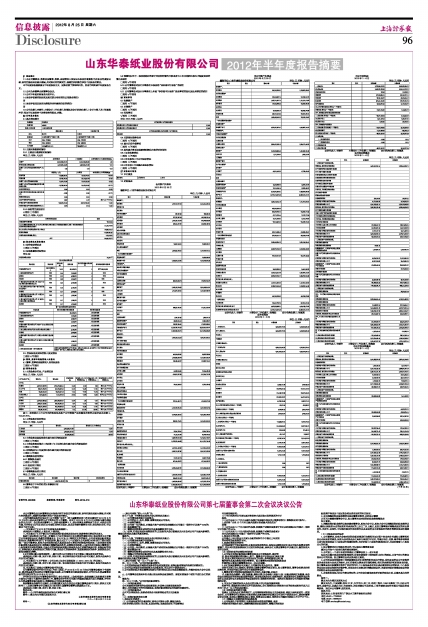 山东华泰纸业股份有限公司(以下简称“公司”)第七届董事会第二次会议通知于2012年8月12日以专人送达及传真的方式下发给公司9名董事。会议于2012年8月23日以现场与通讯相结合的方式召开。会议应表决董事9人,实际表决董事9人,部分监事及高管列席了会议,本次会议的召集、召开符合《公司法》和《公司章程》的有关规定。会议由李建华董事长主持,经过充分讨论,审议通过了如下议案:
