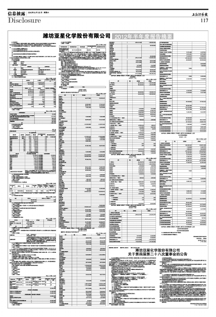 潍坊亚星化学股份有限公司2012年半年度报告摘要
