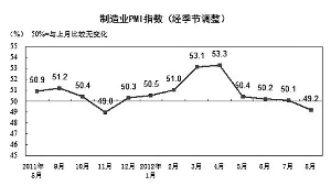 中国物流与采购联合会、国家统计局服务业调查中心发布的8月份中国制造业采购经理人指数(PMI)为49.2%。这是PMI指数自去年11月以来首度跌破50%,创9个月新低。这一数据显示经济下行压力仍较大。不过,从各分项指标来看,未来制造业总体生产水平将平稳恢复,经济增速回调态势有望结束。