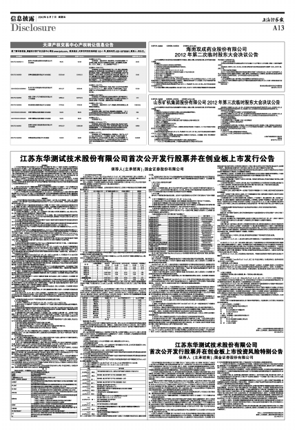 江苏东华测试技术股份有限公司(以下简称“发行人”)首次公开发行(以下简称“本次发行”)不超过1,109万股人民币普通股(A股)并将在创业板市场上市。本次发行将于2012年9月10日分别通过深圳证券交易所交易系统和网下发行电子化平台实施。发行人、保荐人(主承销商)特别提请投资者关注以下内容: