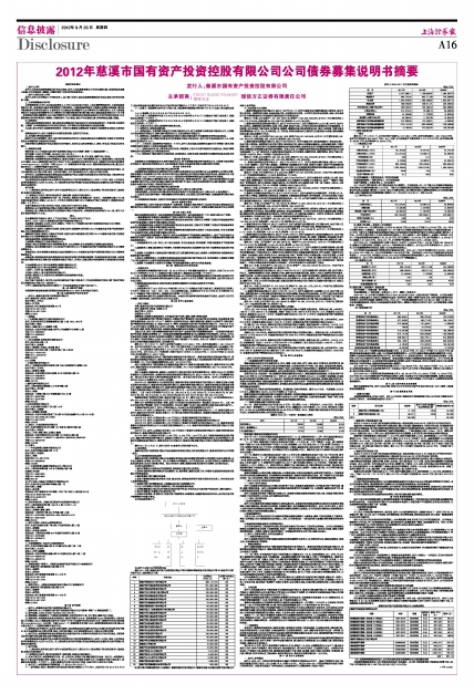 募集说明书摘要:指发行人根据有关法律、法规为发行本期债券而制作的《2012年慈溪市国有资产投资控股有限公司公司债券募集说明书摘要》。