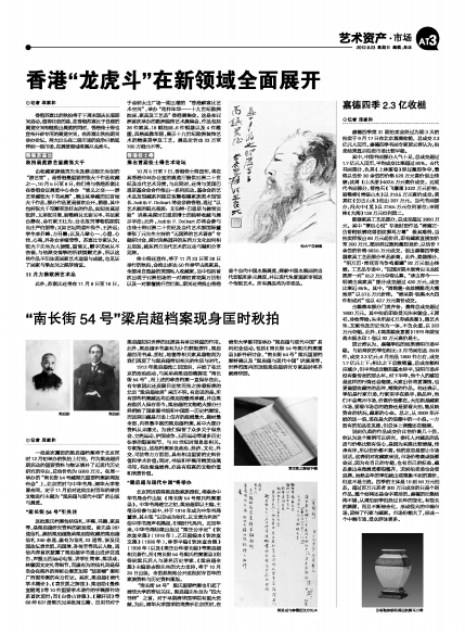 一批首次露面的梁启超档案将于北京匡时12月初举办的秋拍上付拍,作为梁启超后期活动的重要资料与物证填补了近现代历史研究的空白,总估价约为5000万元。在周一举办的“南长街54号藏梁氏重要档案新闻发布会”上,北京匡时与中华书局、清华大学签署合同,定于11月前对这批尘封百年的珍贵文物进行主题为“梁启超与现代中国”的出版与展览。