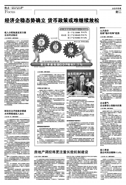 一方面,三季度GDP增速虽然在回落,但回落幅度比上个季度收窄0.3个百分点;另一方面,9月份无论是制造业采购经理人指数(PMI)等先行指标,还是工业生产增速、投资、消费、出口等数据均有所回暖。