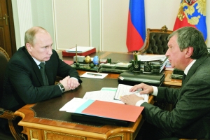 图为10月22日,俄罗斯总统普京会晤俄罗斯石油公司首席执行官伊戈尔-谢钦。