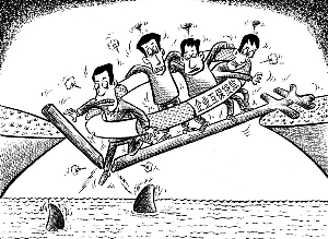 多家企业互相担保贷款,是温州民企中非常流行的融资方式。如今,这种看似方便快捷的贷款方式,因为整个担保过程过随意而陷入了极度困境之中,一些本来很具发展潜力的企业不仅得不到银行贷款,还要替担保对象背负巨债。漫画 刘道伟