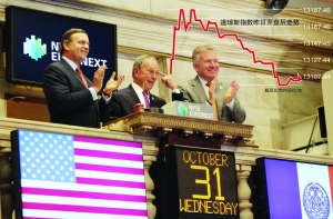 图为纽约市长布隆伯格(中)、纽交所首席执行官邓肯·尼德奥尔(右)和纽约副市长在开市仪式上,为重新开市敲锣。