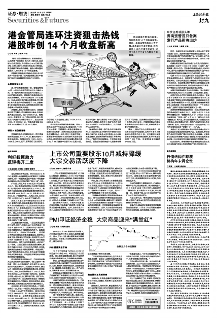 热钱涌入香港后积极参与股市,导致港股近期节节攀升。昨日港股低开高走,恒指尾盘再度出现拉升,收于21821.87点,涨幅0.83%,再度刷新14个月收盘新高;国企指数在内地股市大涨的呼应下,更是大涨1.13%,报10701.21点。市场总成交额也回升至500亿港元以上,达587亿港元。