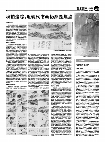 与此相关,拍品发生了变化:古代书画的作品占据了排行榜前三甲;近现代书画板块里也不再是清一色的大师巨作,以高价作招牌,不忌讳“熟面孔”,而是强调“生面孔”,强调低价,强调有看头。于是,各地买家追捧的地方大名头,一些刚刚可以划出当代书画板块的新名头,也进入了大观的名单。正如大观的策划者、中国嘉德近现代书画总经理郭彤所说的,力图打造高端拍卖平台的“大观”,意在筑巢引凤,在市场调整中不得不与时俱进放低身段,主要是为了将其做成“嘉德的眼睛”。