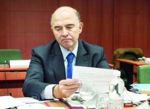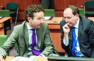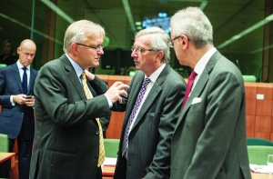 上图为欧盟经济与货币事务专员瑞恩(左)与欧元集团主席容克(中)在现场交谈。