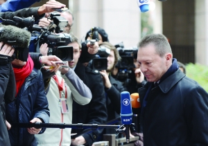 图为希腊财长斯图纳拉斯抵达欧盟总部参加欧元区财长会议。
