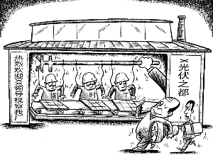 全球太阳能光伏产能严重过剩,号称太阳能光伏之都的广西兴安还在全力打造千亿元光伏产业园。无奈园内所有公司停产日多,生产日少,有的工资拖欠两个多月都没有发。每逢有领导来视察,附近农村的临时工就会被叫来穿上统一工作服表演上班。 漫画 刘道伟