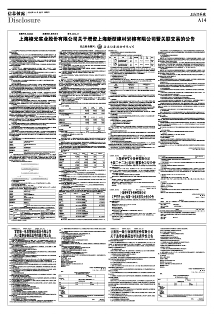 上海棱光实业股份有限公司关于增资上海新型建材岩棉有限公司暨关联交易的公告