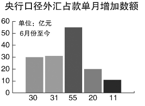 但是从去年第四季度,情况出现了变化。记者观察,从去年10月份至今的一年时间里,除了今年年初的三个月,其余月份央行口径的外汇占款一直维持较低水平。去年第四季度,央行口径外汇占款出现罕见的负增长,而在今年一季度短暂的反弹后,4月和5月央行口径外汇占款再次出现负增长,分别减少了625亿元和15亿元。6月份至今,单月增加的数额分别是30亿元、31亿元、55亿元、20亿元和11亿元。