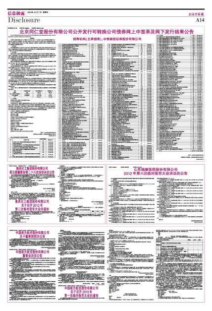 北京同仁堂股份有限公司公开发行可转换公司债券网上中签率及网下发行结果公告