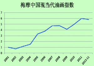 根据梅摩艺术品指数研究中心最新发布的报告,在2012年11月过后,梅摩中国现当代油画指数下跌了3.1%,相比于八月底时8.1%的降幅,下降幅度明显缩小。市场呈现出的回调态势,使得艺术品市场的氛围有所好转。截至11月底,梅摩世界艺术品综合指数小幅下降了1.7%,表现略微优于中国艺术品市场,这两个指数都逐渐从年初时较大的跌幅中复苏。