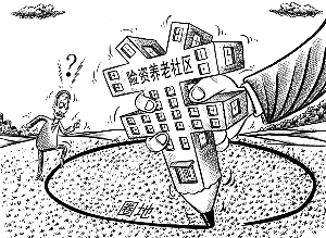 在无法直接进入商业地产的背景下,保险资金将目标锁定在了未来盈利前景看似美好的养老产业上,大举进军养老产业。可已对外销售挂钩的养老产品,要300万才获得入住资格。这不能不让人怀疑保险资金是否在以养老的名义圈地、买房?漫画 刘道伟